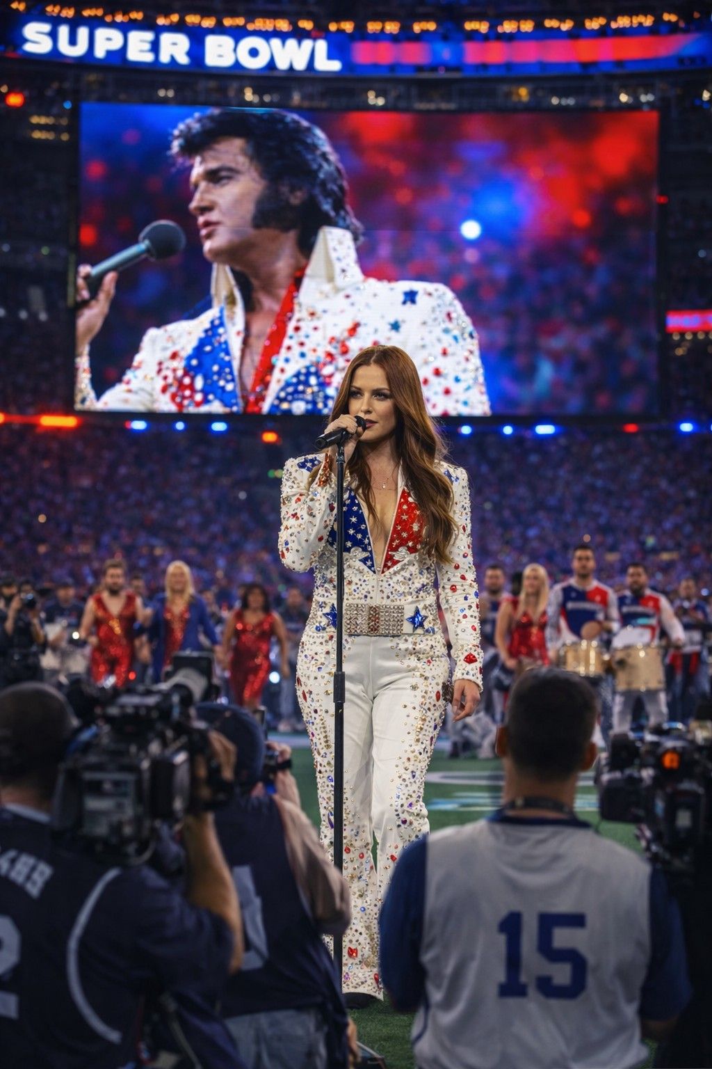 As she stepped beneath the lights, giant screens around the stadium began showing black-and-white images of Elvis Presley throughout his life. There was young Elvis smiling beside his guitar, Elvis commanding the stage before roaring crowds, Elvis with family, Elvis in moments both legendary and deeply human. The images reminded the audience that behind the icon was a man whose influence touched generations.